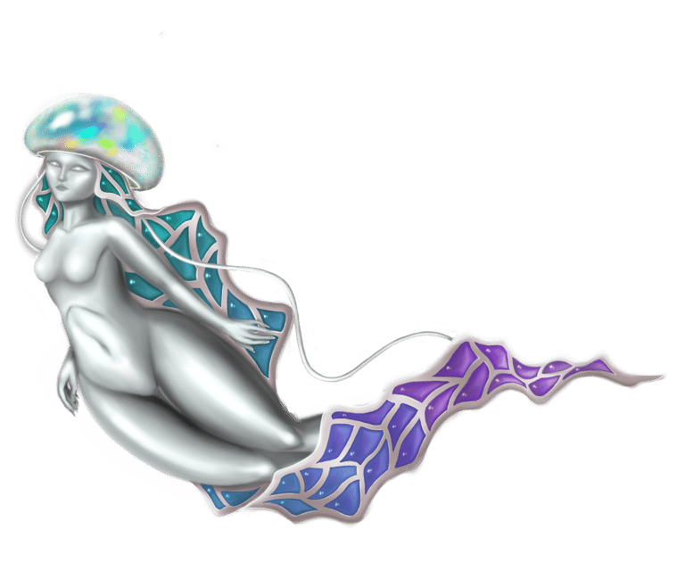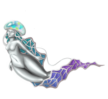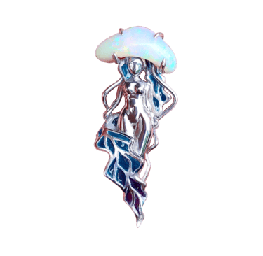 Mon logo représente une nymphe des eaux, mi-femme, mi-méduse, en or blanc, or rose, émail et opale. Je l'ai moi même dessiné et j'en ai également fait un bijou en argent Héléades.